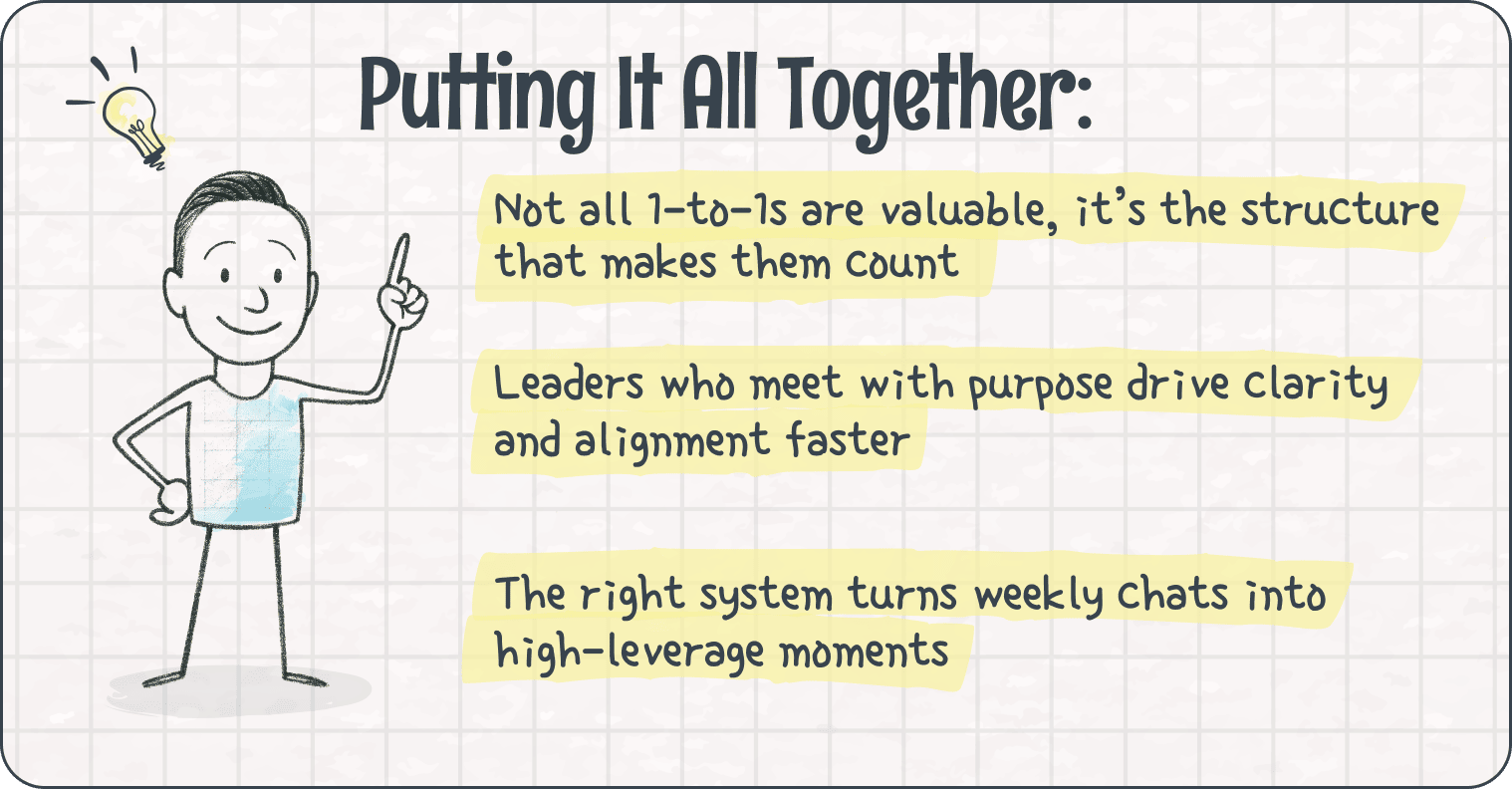 Of the 6 people that I now actively manage, only 2 I meet with 1-on-1 once a week…and when we meet, we maximize our time together via a specific system.