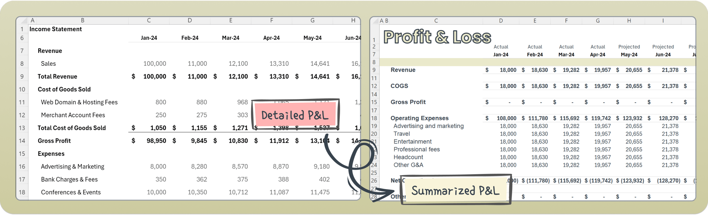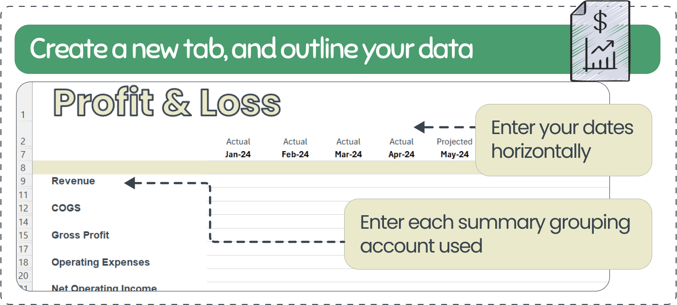 Your Profit & Loss will oftentimes take up dozens and dozens of rows.