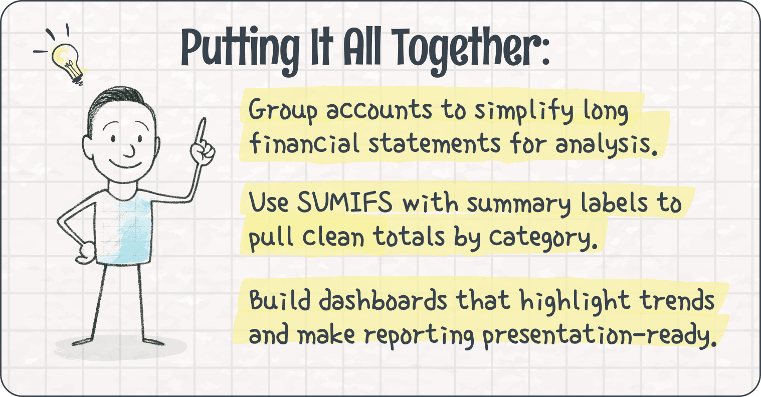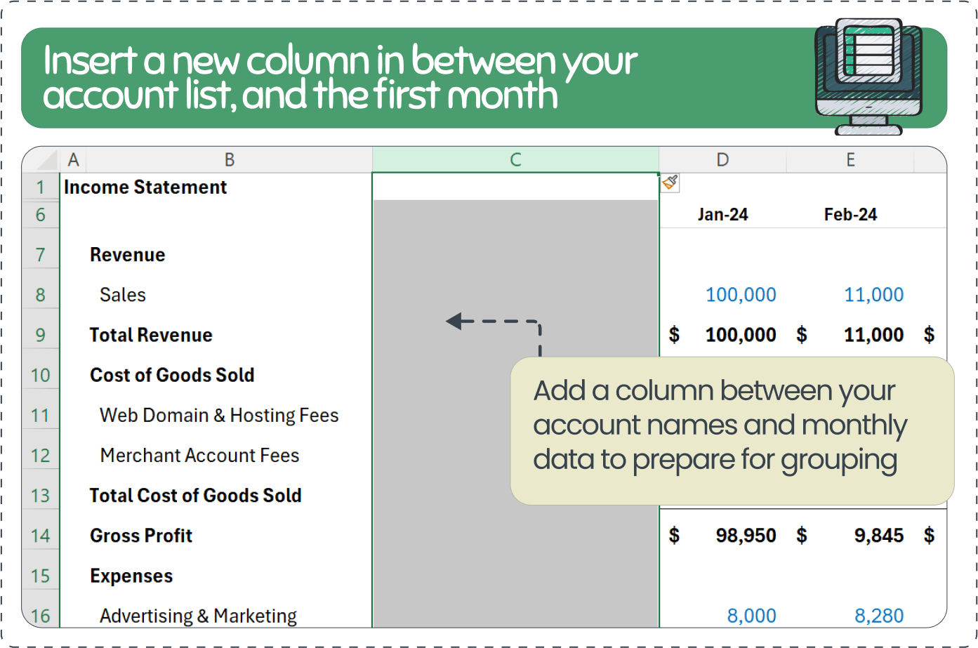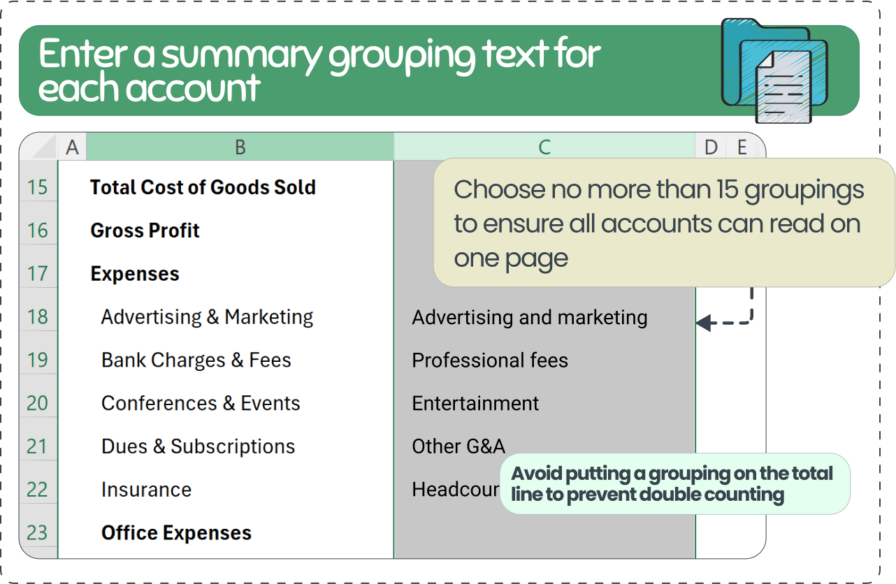 Add a new column after your account list called “Summary Grouping”, and start mapping out each account to the summary grouping that you want it to show under.