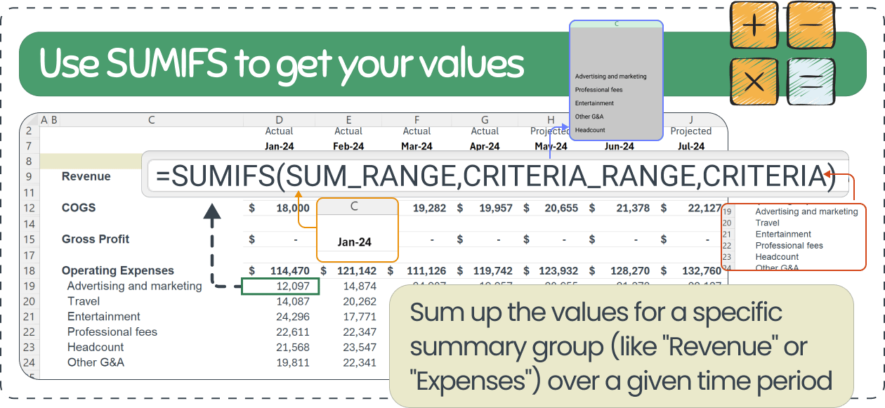 Now is where the magic takes place. The SUMIFS formula allows you to SUM values IF they meet 1 or more criteria.