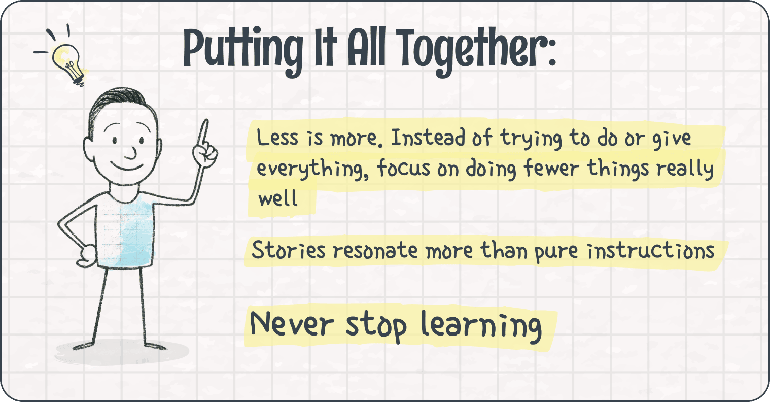 One of the best learnings of this year came from Russell Brunson in his book Expert Secrets. Learning happens when one has an epiphany. Instead of trying to give someone an epiphany, tell them the story of when you got this epiphany. In doing so, you transfer the epiphany in the most powerful way (notice how I'm using a story of how I learned this to each it to you?)