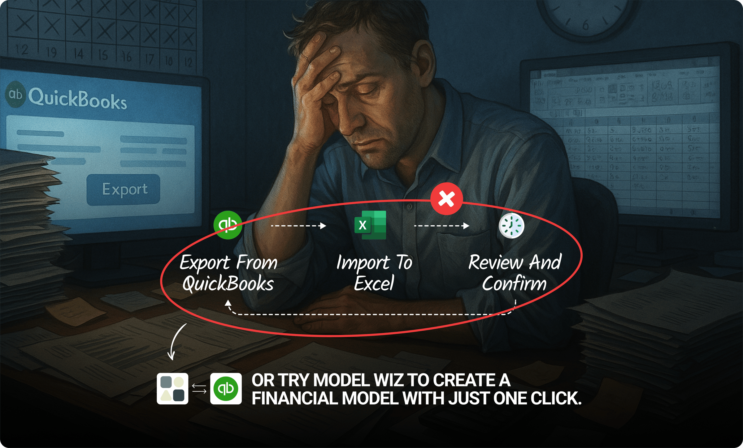 Every month it's the same routine: export from QuickBooks, import to Excel, spend hours making sure everything ties out. Then do it all over again next month. Model Wiz connects directly to your QuickBooks and creates data-connected financial models using your actual client data. What used to take hours now happens with one click.