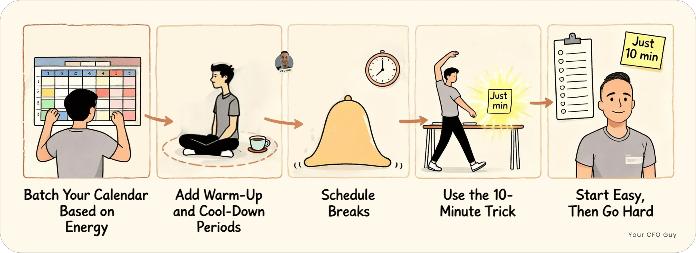 Instead? Block your meetings together. Then your breaks. Then your deep work sessions.